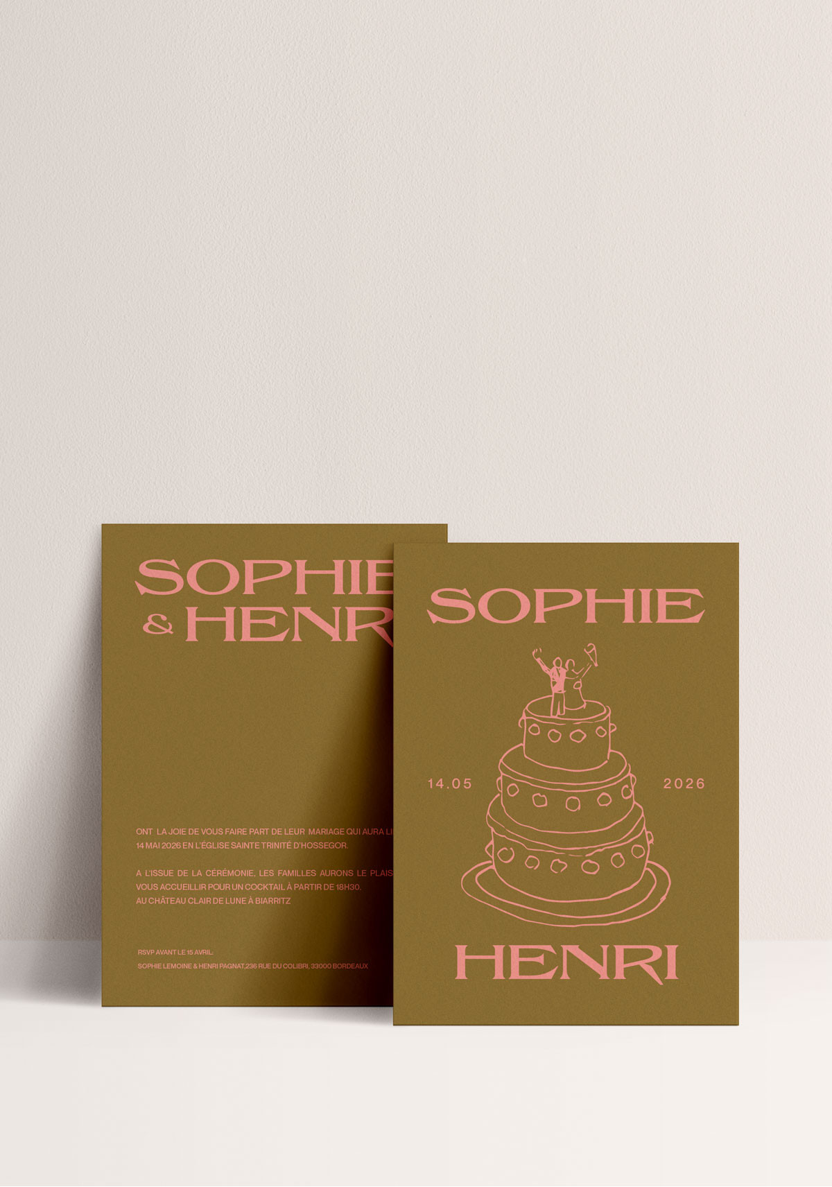 Discover the "Love at First Sight" wedding invitation, a retro-chic design that will appeal to couples seeking a unique and bold look. With its warm camel background and pastel pink illustrations, this invitation plays on an elegant contrast that immediately catches the eye. The modern, graphic typography highlights the names of the future bride and groom, while the delicate illustration of the cake joyfully symbolizes the upcoming celebration. Ideal for announcing a trendy, original, and personalized wedding, this "Love at First Sight" invitation stands out for its artistic and contemporary aesthetic. Printed on traditional paper, it offers a refined and lasting finish. Perfect for couples wishing to share their love with an invitation that has a strong character, is both stylish, minimalist, and undeniably romantic. A choice that will make a lasting impression from the moment the envelope is opened.